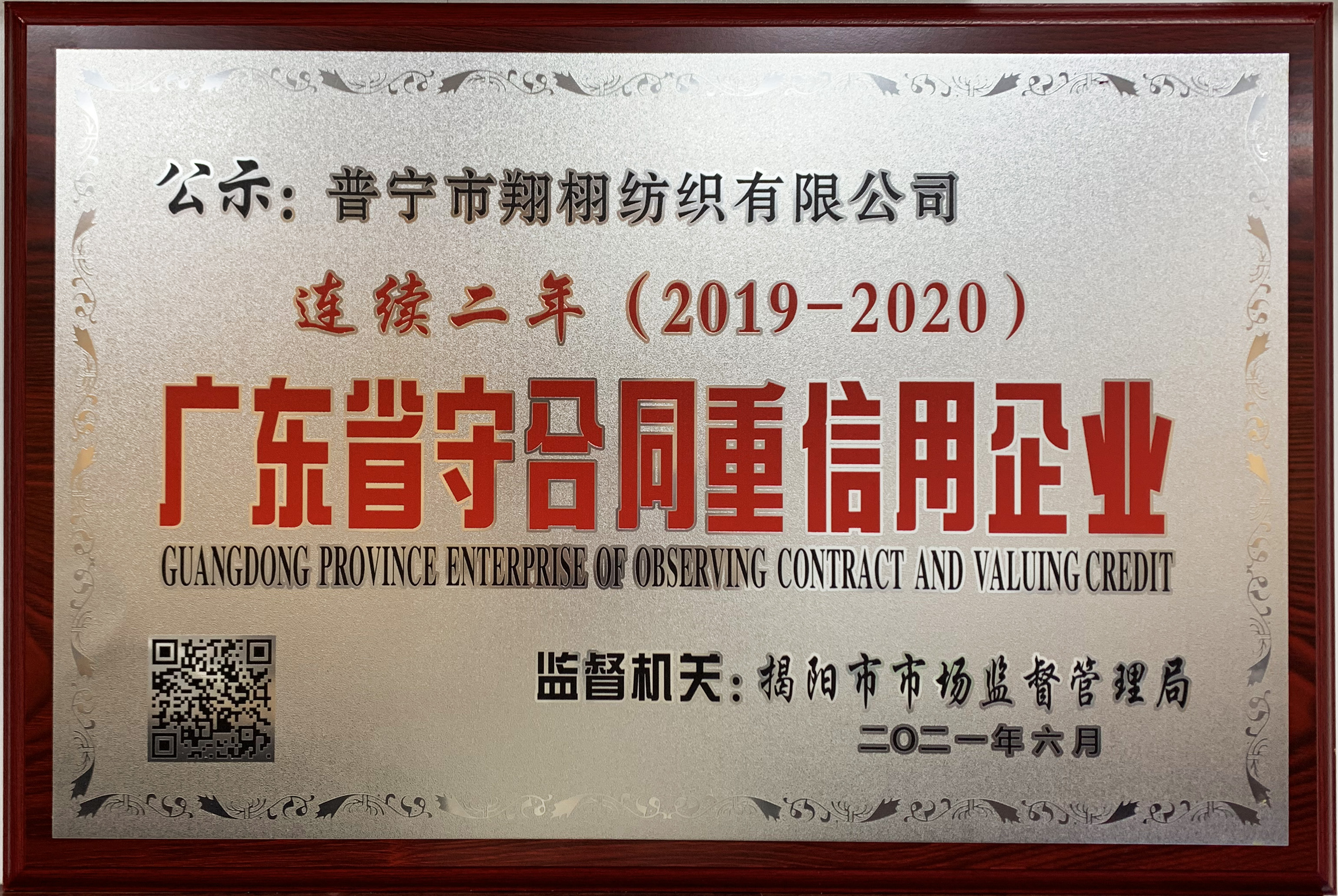 翔栩纺织·连续二年(2019-2020)广东省守合同重信用企业