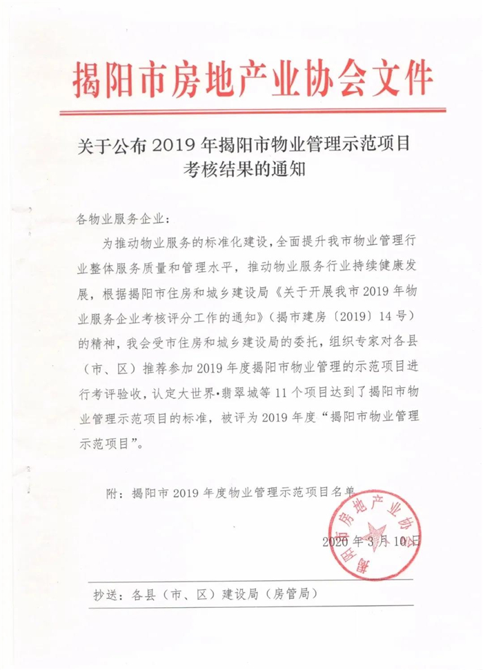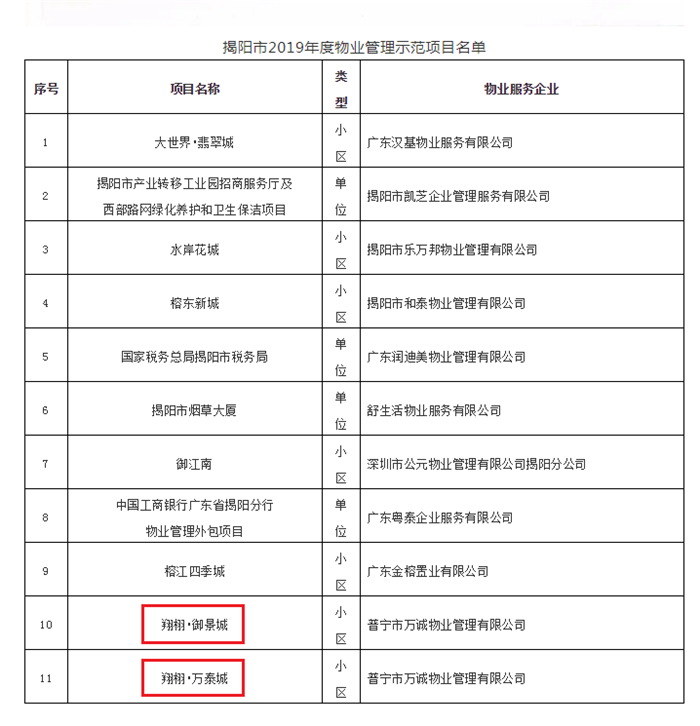 翔栩·万泰城、御景城获评2019年度“揭阳市物业管理示范项目”