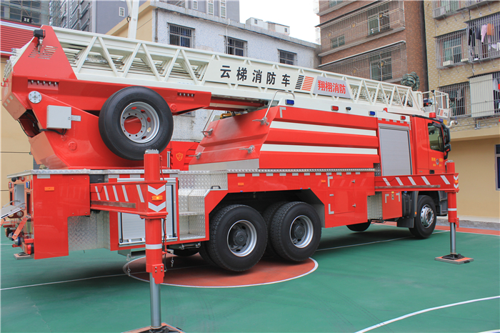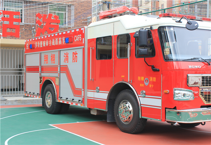 演练结束后,翔栩消防队员带领一行人员参观翔栩消防队的消防车系列,详细介绍了多功能城市主战消防车、20米高喷射消防车、40米云梯消防车的车辆性能、水罐吨位以及执勤功能等。