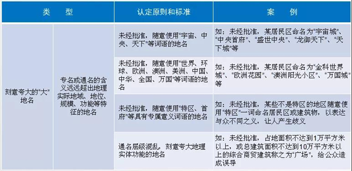 刻意夸大地域、规模、功能的“大”地名,包含外国人名、地名、外语词的“洋”地名,用字不规范、怪异难懂的“怪”地名,重名同音的“重”地名,这些都算。还有一些道路、街巷修建多年后仍没有标准名称,这样的就叫“有地无名”。此外,一地多名、一名多写也是不规范的。