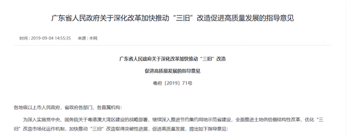 近日,广东省人民政府发布了《关于深化改革加快推动“三旧”改造促进高质量发展的指导意见》。《意见》围绕“三旧”改造入库门槛高、规划调整难、税费负担重、土地征拆难等问题,坚持问题导向和系统思维,并提出19条针对性的改革措施。《意见》自2019年9月30日起施行,有效期5年。