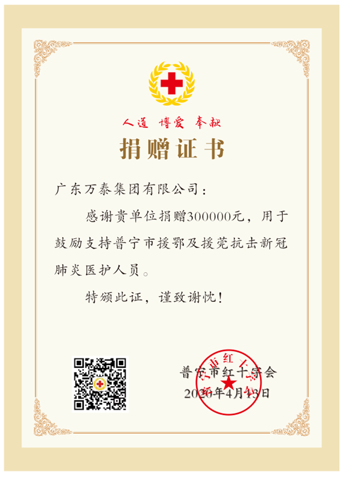 广东万泰集团通过捐款支持,鼓励普宁市援鄂及援莞抗击新冠肺炎医护人员,向他们致以最崇高的敬意。同时希望这种守望相助、大爱无私的可贵精神能继续传承和发扬下去。