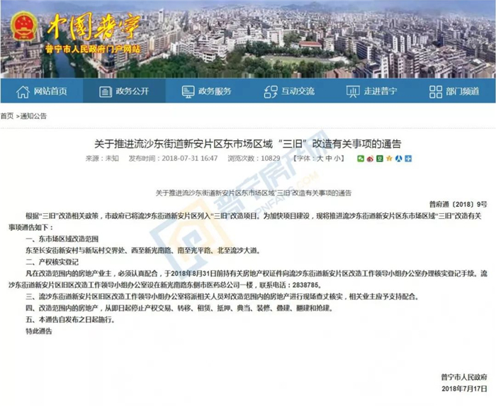 2018年7月,普宁市人民政府发布了《关于推进流沙东街道新安片区东市场区域“三旧”改造有关事项的通告》。