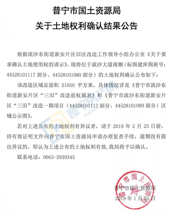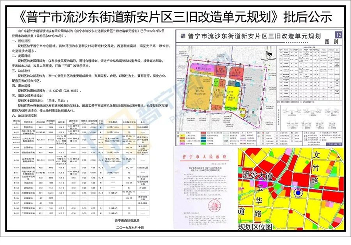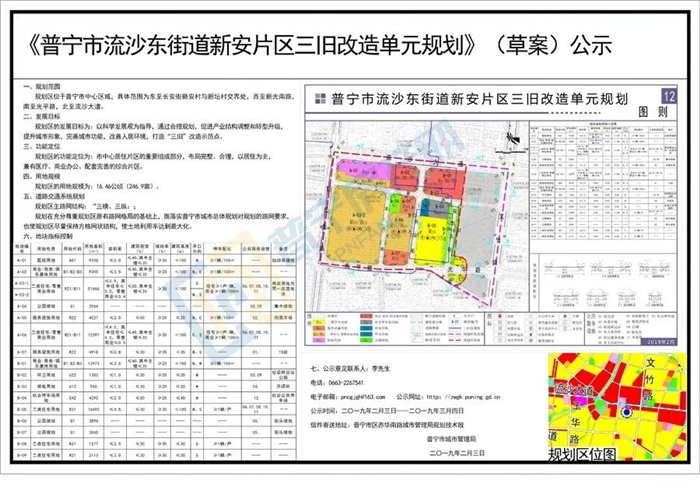 2019年7月,《普宁市流沙东街道新安片区三旧改造单元规划》获市政府批复,普宁市自然资源局对对其进行批后公示,将打造为“三旧”改造示范点。